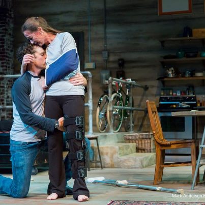 In the wonderful, emotionally charged “Time Stands Still,” playing through Sunday, Sept. 16th at Theatreworks in Mountain View, photo journalist Sarah Goodwin (Rebecca Dines) returns to her Williamsburg apartment after being hit with a roadside bomb in Iraq. It is her reporter boyfriend James (Mark Anderson Phillips) who is dealing with his own guilt after leaving Sarah alone to deal with her injuries. To further complicate matters, mutual friend Richard (Rolf Saxon) brings his much younger girlfriend Mandy (Sarah Moser) to meet the couple, and provide an interesting counterpoint to where Sarah and James might be headed as a couple.