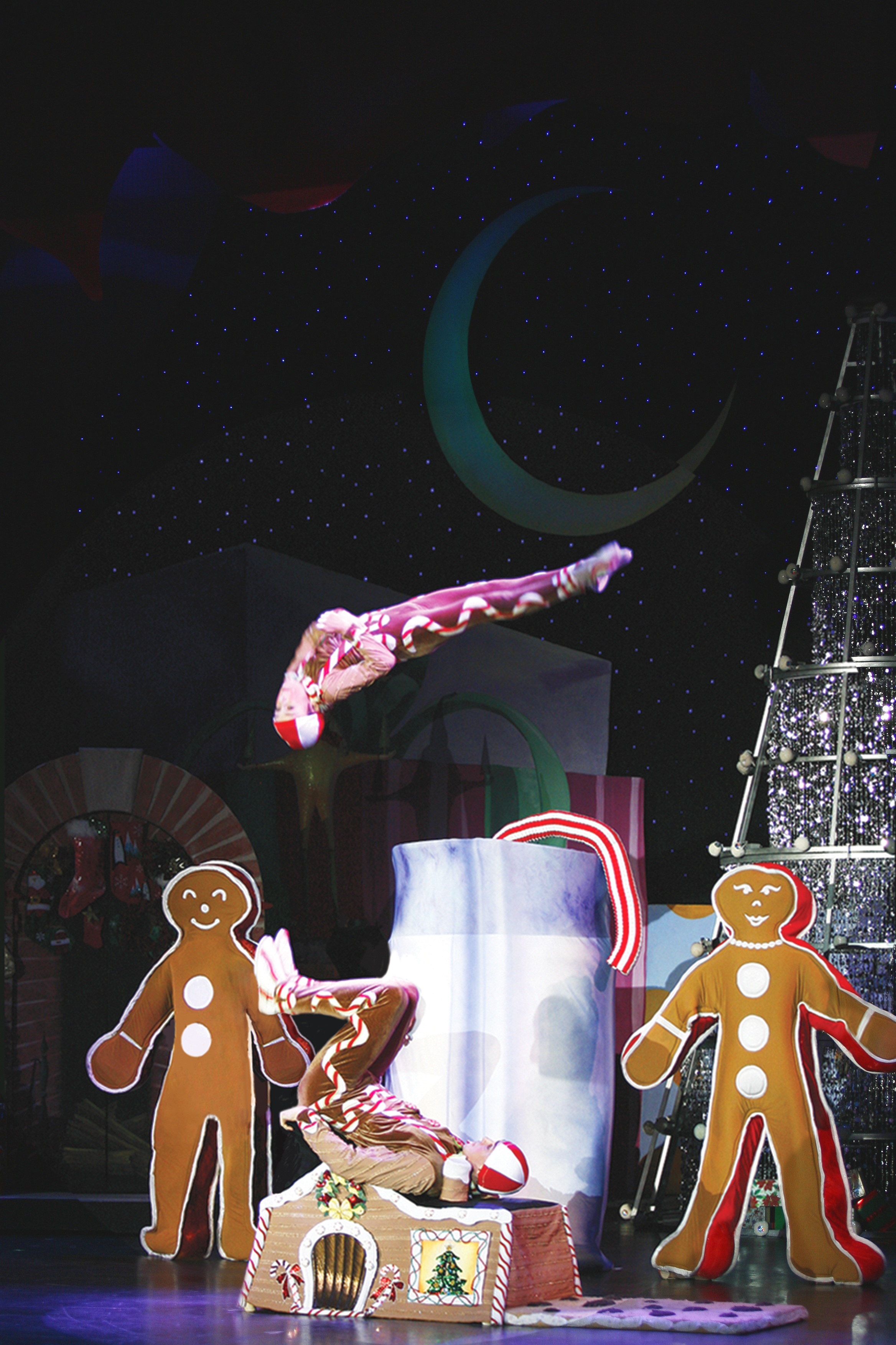 So many performers go about their craft with such gusto, which creates a strong feeling of jaw-dropping awe amongst the house. Contortionist sisters Buyankhishig and Erdenesuvd Ganbaatar from Mongolia were a marvel as they created an evocative Christmas ornament high atop the stage. The power and grace at “break-neck” speed of Ukrainians Viacheslav Liubivets and his roller skating partner Olena Olnieva was astounding, And Rony Gomez Pupo showcasing his amazing coordination when it comes to juggling was sharp and precise. And in just another example of physical dexterity, A gingerbread cookie Samail Haftu uses his feet to flip around a gingerbread cookie boy, Amanual Hayle, up and down, around and around. Just plain crazy.